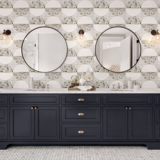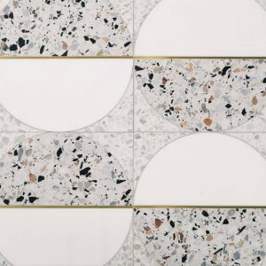 Cerchio gracefully combines stone, terazzo and metal in an avant garde waterjet mosaic pattern.