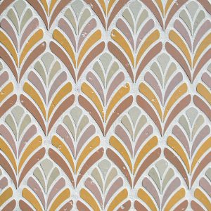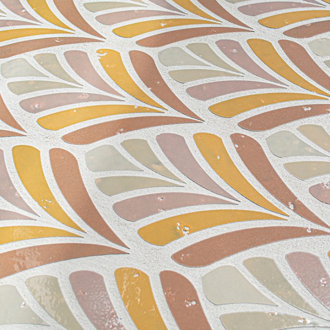 Margot, a waterjet mosaic shown in Honeysuckle, Primrose, Goldenrod, and Tulip Glazed Basalto™ by New Ravenna for Decorative Materials.