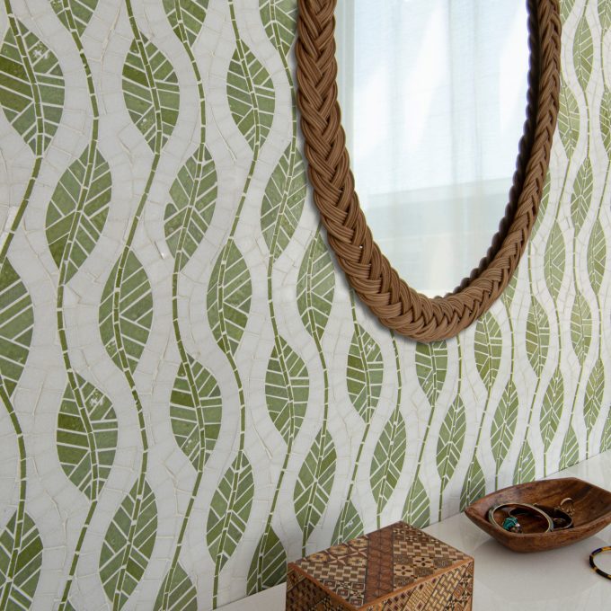 Coccoon, a hand-cut mosaic shown in polished Thassos and Sweetgrass, is part of the Biome collection by New Ravenna.