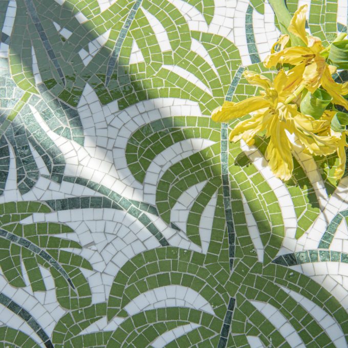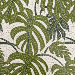 Queen Palm, a hand-cut stone mosaic show in polished Dolomite, Fern, and Spring Green, is part of the Biome collection by New Ravenna.