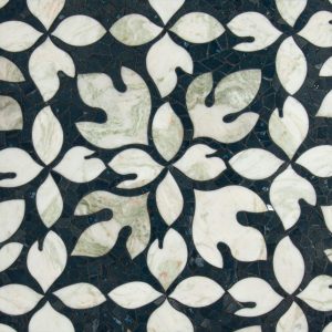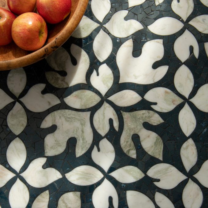 Sassafras, a hand-cut and waterjet mosaic shown in polished Orchid and Alba Chiara, is part of the Biome collection by New Ravenna.