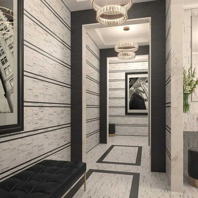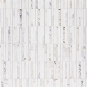 DESCRIPTION The fascinating range of natural stone is celebrated with our Abbey Road mosaic. Elongated rectangles are precisely placed to create linear columns which can be installed horizontally or vertically. Ideal for use on walls and floors, Abbey Road is available in milk-white Bianco Dolomiti, with drifts of taupe veins; classic Calacatta Gold, dramatic Nero, and softly translucent Vanilla Onyx, all in a honed finish.