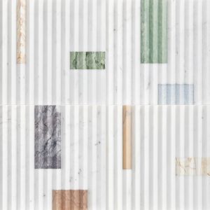 DESCRIPTION Pinnacle Fete adds variety to the modern classic Pinnacle design by inserting colorful, sculpted marbles and quartzites in a rhythmic patchwork within the carved, triangular flutes of the background stone.Pinnacle Fete is offered in two colorways: Nero, with rich blues, greens, pinks and gold against a ground of white-veined Nero marble; and Pastel, with multi-color marble inlays in a range of soft pale shades, on a ground of crystalline Igloo marble. The full repeat is 24" × 24", created by four distinct 12" × 12" parts. The scintillating visual rhythm of the repeat will create walls of true sophistication.