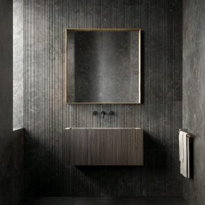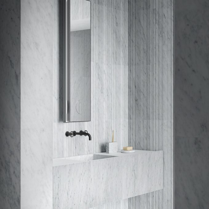 DESCRIPTION With a nod to the décor of the 1950s and 60s, Adda represents a retro-contemporary collection that plays with the inherent properties of different materials in the coolness of natural stone, the warmth of wood and the muted elegance of burnished brass. An extraordinarily versatile collection, it includes modular components which can be combined in an almost infinite number of configurations to create the look, style and dimensions you want. Choose from a height of 20 or 40 cm, a length of 60 or 90 cm, with or without a drawer. The stone basin comes in both a countertop and integrated variant with facings in wood or brass. Available in Bianco Carrara, Crema d’Orcia, Grigio Versilia, Gris du Marais®, Pietra d’Avola and Silk Georgette® with facings in smooth and ribbed walnut, smooth maple and thermo-treated oak and burnished brass. Pictured in three different configurations.