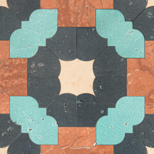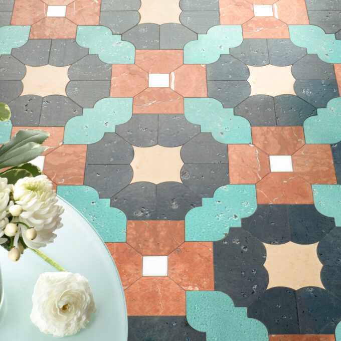 Sitges is a waterjet mosaic shown in honed Orchid, Aloe, Lagos Gold, Calacatta Monet and Rojo Alicante.