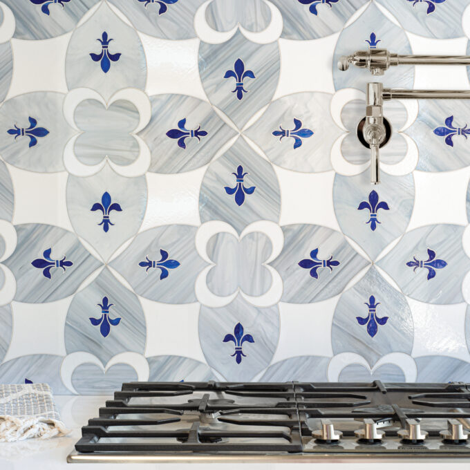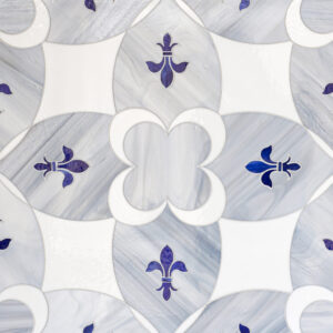 Ile Saint-Louis is a waterjet glass mosaic shown in Absolute White, Pearl and Lapis Lazuli. - NOTES 2.83sf Template Size. 20-3/16" x 20-3/16" Repeat Size.