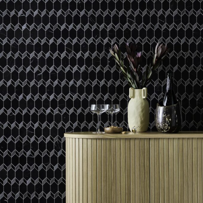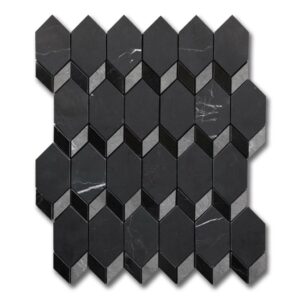 DESCRIPTION Eternal. Elegant. Elevated. The Infinity Collection combines traditional roots with modern geometry. Infinity Moment Tulip Black creates a stunning backsplash with honed, sandblasted, and polished pieces. The intermittent stroke of white veining adds dimension to the black marble stone.