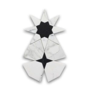 DESCRIPTION Let your imagination soar with the Kaleidoscope Star Calacatta with Tulip Black marble mosaic, a masterpiece brought to life by the exceptional designer Young Huh. This mosaic features a whimsical star pattern crafted from the finest Calacatta marble and Tulip Black elements, creating a celestial and enchanting ambiance. Watch as this masterpiece infuse your home with a sense of wonder, luxury, and a cosmic touch.