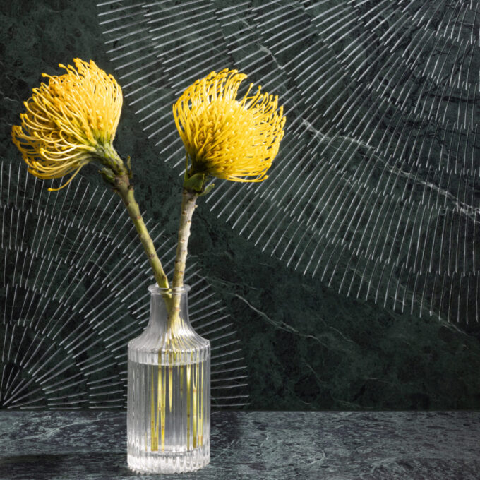 - DESCRIPTION Meet Soleil Green Serpentine: A circular burst of lines, meticulously carved in stone. Available in deep green serpentine or elegant black marble. To create the repeating pattern, rotate each piece 90 degrees clockwise to form an orbit of two interlocking circles. Choose to embrace its natural grace by installing Soleil unfilled or pick a contrasting or metallic grout to further define this stellar pattern. Both stones come in 16" x 16" x 3/8" tile with a honed finish.
