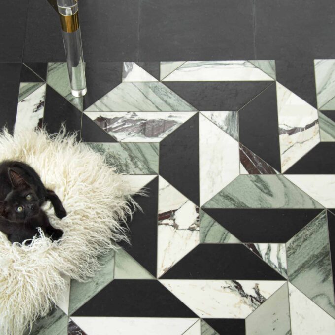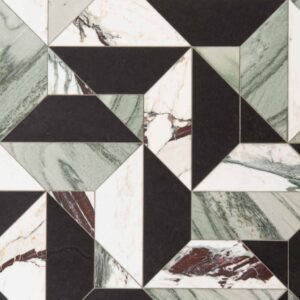 Shown in polished Kay’s Green, Plumeria, and honed Orpheus Black. - NOTES 3.69sf Template Size. 23-1/16” x 23-1/16” Repeat Size.
