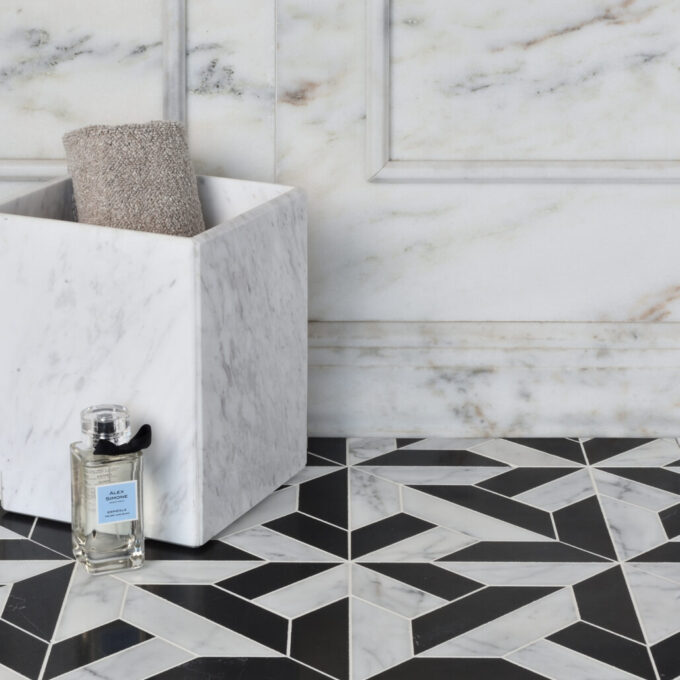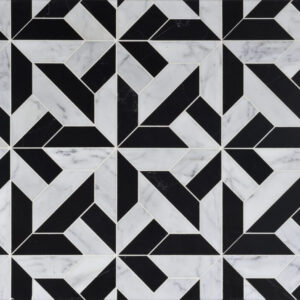 Pompidou Signature Bold Quick-Ship is shown here in Nero Panthera (Honed) and Statuario (Honed). Choose from the newest colorways and design with endless possibilities. - NOTES 1sf Module Size.