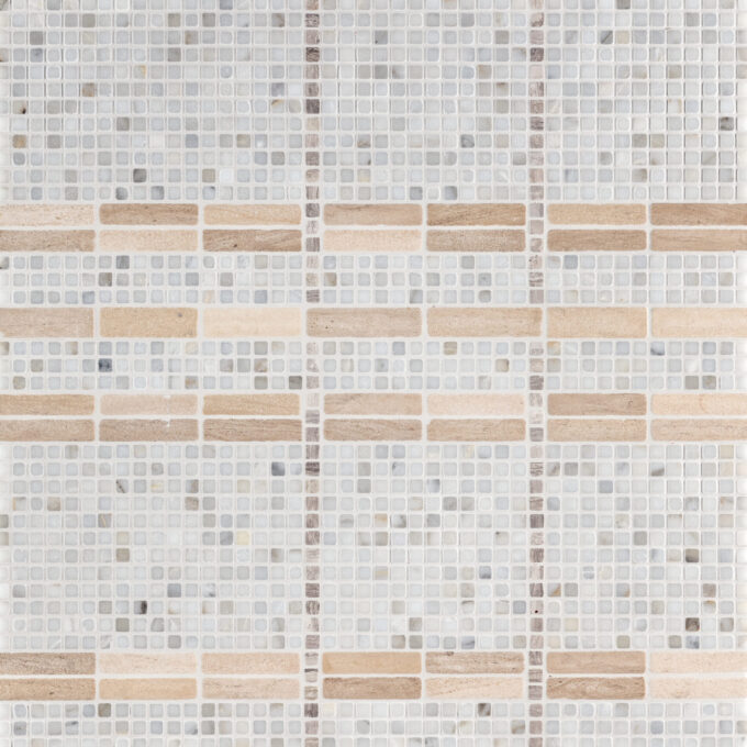 DESCRIPTION Shadow Stripe Moca Mosaic is from a collection inspired by the timeless appeal of stripes and plaids. The Handloom Collection offers three distinct patterns for countless design possibilities. This pattern weaves together small mosaic chips with a bold, thicker stripe at its center. This reinterpretation of a classic pattern is available in Pink, Moca, and Viola colorways. It combinines soft, luxurious stones like Rosa Perlino, Calacatta Gold, Bianco Antico, Belgian Blue, and Viola, in serene, understated palettes.