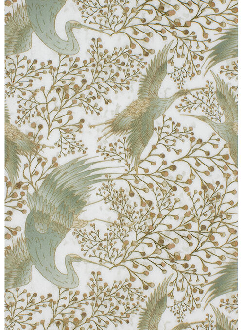 - DESCRIPTION Graceful birds soar through a tapestry of intricate foliage in the Pluma pattern by Stone Impressions. This design, a blend of soft natural tones and golden hues, captures movement and elegance in every detail.