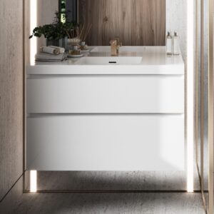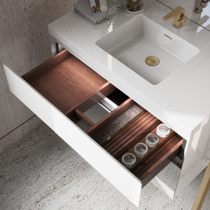 DESCRIPTION The Angolo - 415 vanity features mitered corners, integrated finger pulls, and continuous horizontal grain for a crisp clean look. Angolo also maximizes storage with a shallow top drawer and deeper bottom drawer to store all of your bathroom essentials. This is one of the many customizable vanity options available at Decorative Materials.