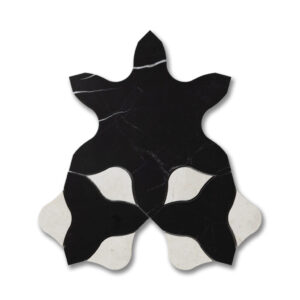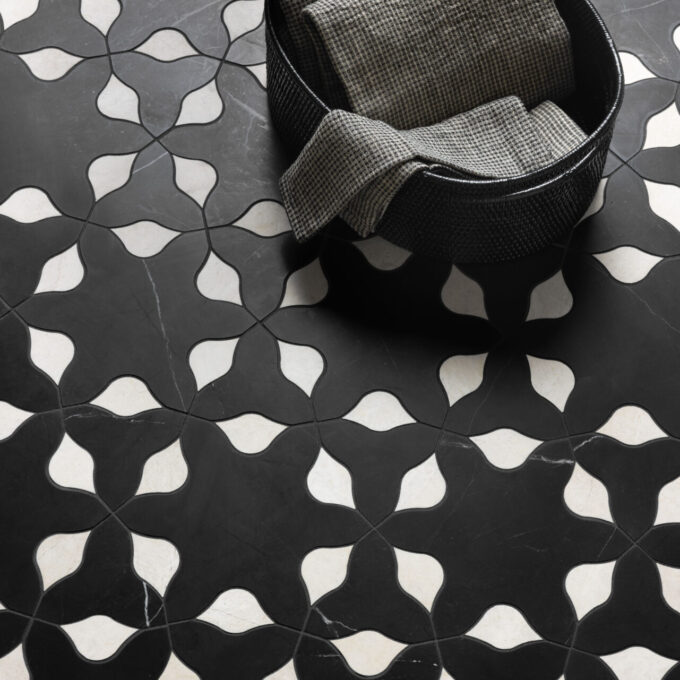 DESCRIPTION Dyad Imala Tulip Black + French Vanilla draws inspiration from timeless geometry, transforming traditional Eastern motifs into a modern expression of elegance. Crafted in marble mosaic form, this design balances depth and harmony, blending structure with softness. Subtle tonal contrasts between brushed Tulip Black and honed French Vanilla create a serene rhythm across each surface.