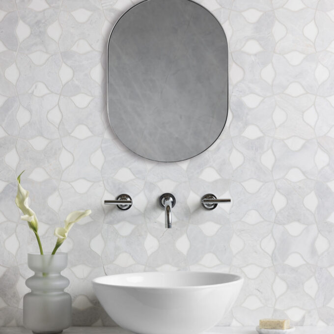DESCRIPTION Dyad Pavo Mystic Silver + Dolomite draws inspiration from timeless geometry, transforming traditional Eastern motifs into a modern expression of elegance. Crafted in marble mosaic form, this design balances depth and harmony, blending structure with softness. Subtle tonal contrasts between honed Mystic Silver and honed Dolomite create a serene rhythm across each surface.