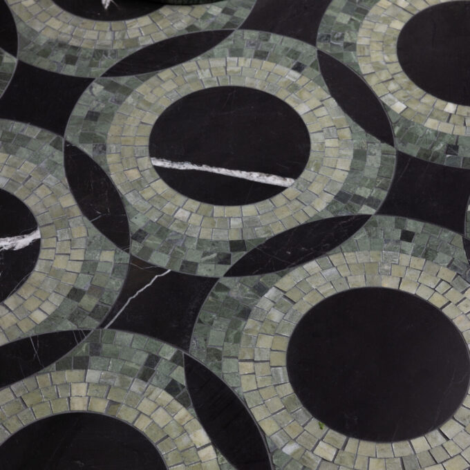 - DESCRIPTION Awaken form and artistry with Musea Circle Moss Green with Verde Laguna & Tulip Black. Hand-chopped fragments create circular and diamond mosaic profiles, each surface honed to reveal rich tonal depth and quiet dimension. The result feels both storied and new—a tribute to grand museum floors, reimagined as a versatile statement for modern spaces. Cultivated. Grandiose. Exquisite. Discover the full Musea Collection at Decorative Materials for historic influence with a modern sensibility.