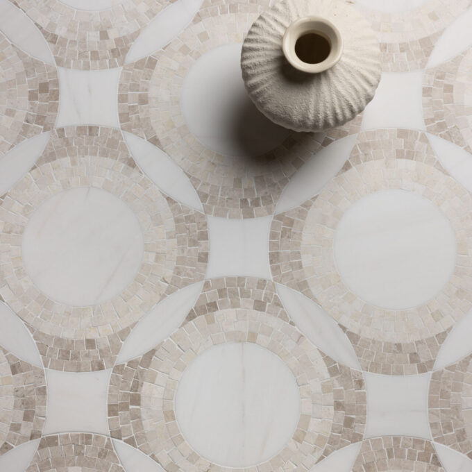 - DESCRIPTION Awaken form and artistry with Musea Circle Odeon Beige with French Vanilla & Dolomite. Hand-chopped fragments create circular and diamond mosaic profiles, each surface honed to reveal rich tonal depth and quiet dimension. The result feels both storied and new—a tribute to grand museum floors, reimagined as a versatile statement for modern spaces. Cultivated. Grandiose. Exquisite. Discover the full Musea Collection at Decorative Materials for historic influence with a modern sensibility.