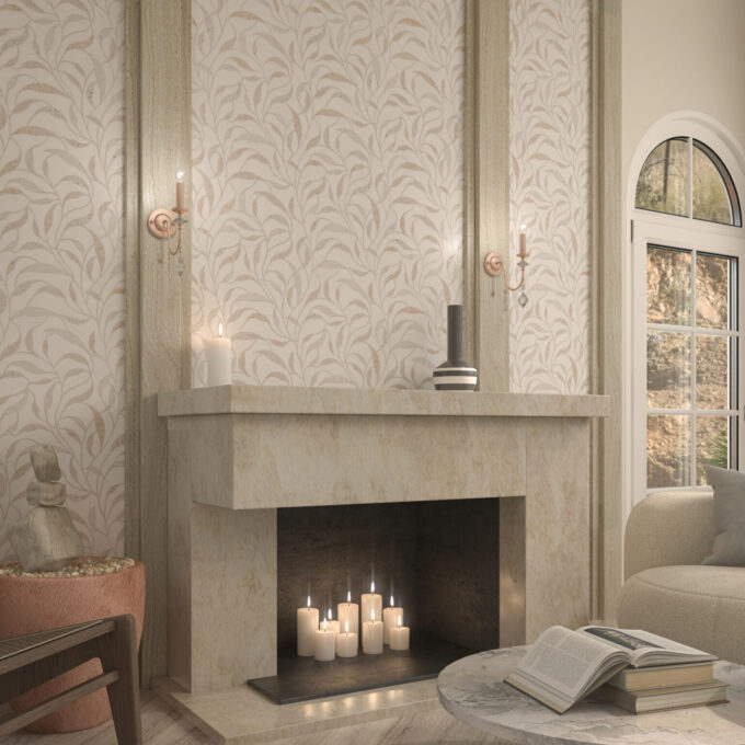 DESCRIPTION Folium Wheat is inspired by botanic motifs. This waterjet mosaic utilizes grout lines intrinsic to the design, each becoming a stem sprouting tumbled tesserae mosaic leaves. Available in two colorways: Wheat and Leaf. Wheat features a Thassos honed background with Rosa Perlino, Vanila Onyx, White Sand, and Crema Marfil leaves. Leaf features a Bianco Antico honed background with Matcha Verde, Moca, Jade Green, and Verde Aurora leaves.