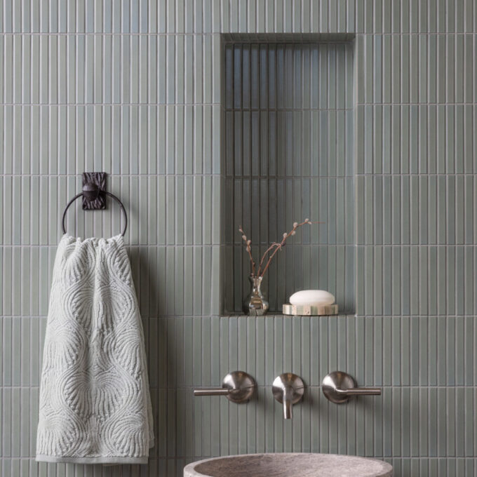 DESCRIPTION Elyra Celestial Jade is a linear porcelain mosaic that brings calm, architectural rhythm to modern interiors. Elongated forms and a refined palette evoke horizon-like movement while adding subtle texture and tonal depth. Durable porcelain construction makes Elyra ideal for walls, showers, backsplashes, and statement installations.