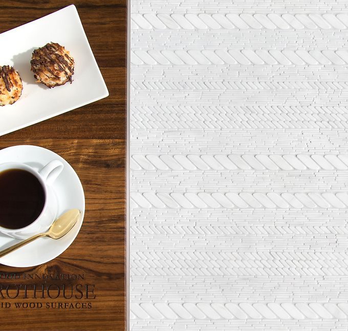 Cardigan, a waterjet and hand-cut mosaic shown in tumbled Dolomite, is part of the Tissé. Dimensions reflect image shown.