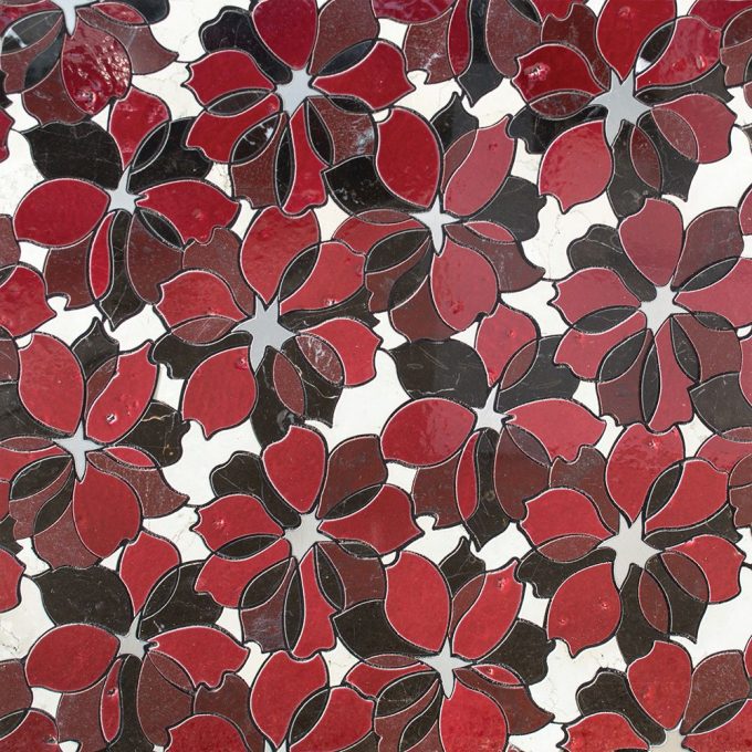 - DESCRIPTION Sybil, a waterjet mosaic shown in honed Bianco Antico, polished Red Lake, Saint Laurent, Zinnia Glazed Basalto, and brushed Aluminum, is part of the Bright Young Things Collection. Dimensions reflect image shown.