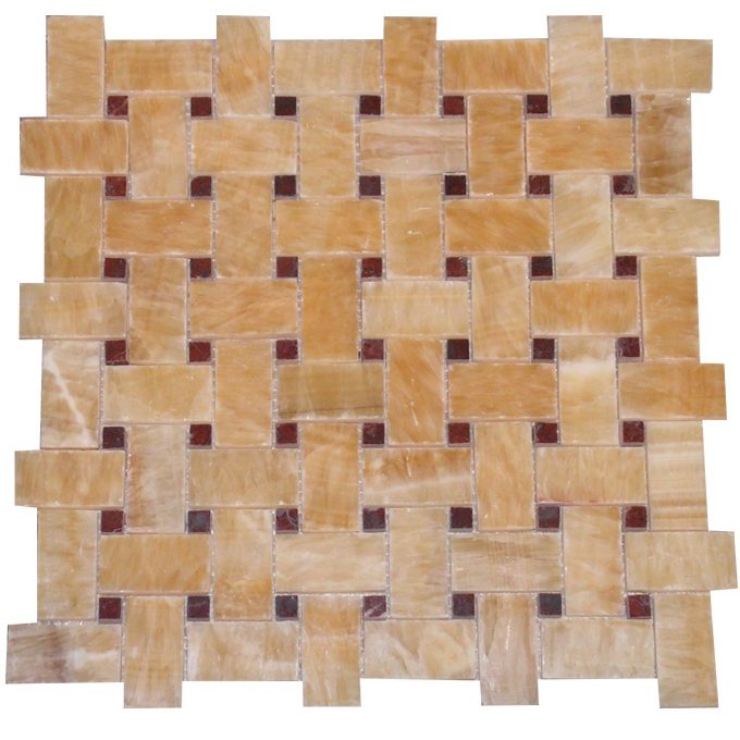 - DESCRIPTION Golden Honey Onyx is a stone with yellow and gold tones filled with swirl like veining. The basketweave mosaic shown here is contrasted with a Red marble dot sure to make a room pop.