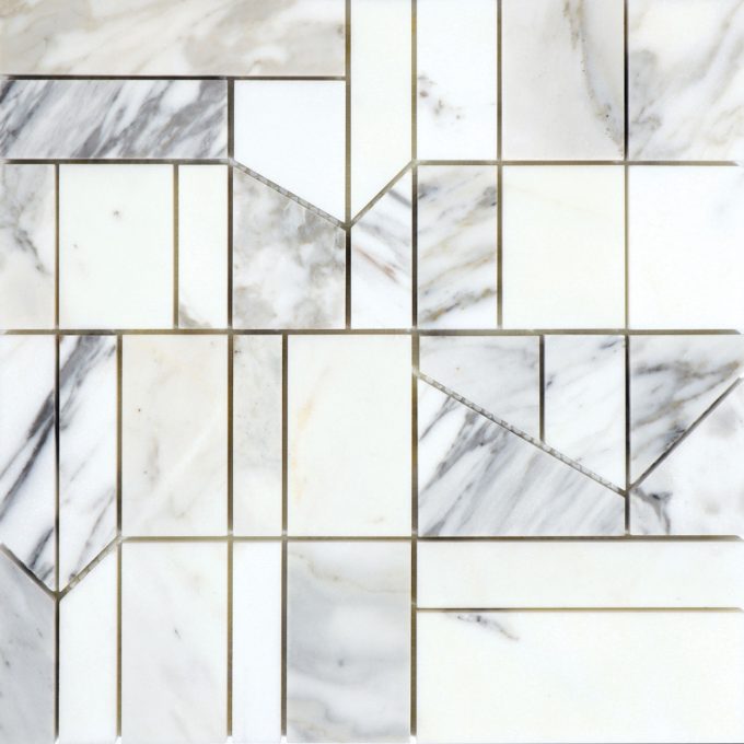 - DESCRIPTION Ideal for a variety of environments, white Calacatta marbles classic gray and taupe movement is showcased in a playful geometric pattern, creating a tasteful design.
