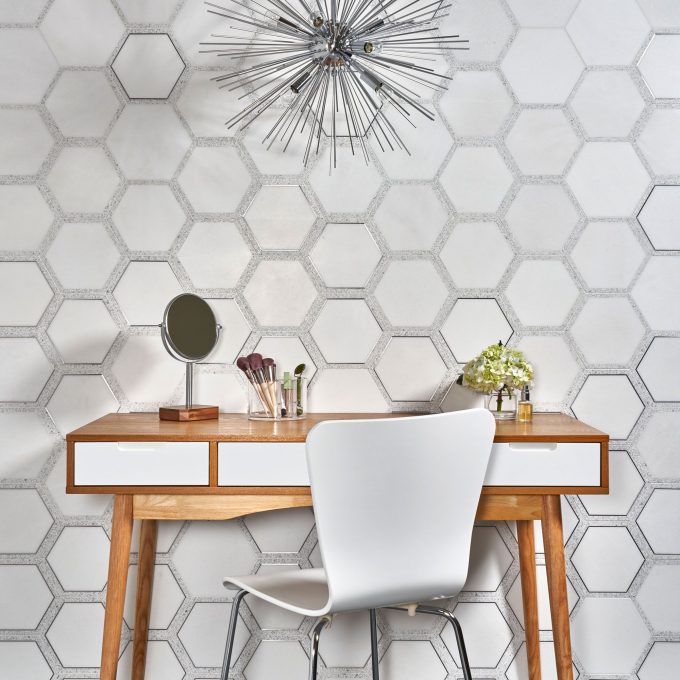 AKDO Next Hex Thassos Honed w/White Terrazzo & Stainless Steel