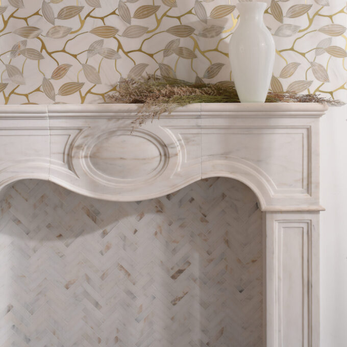 , is a water-jet mosaicinspired by the soul of New Orleans! Shown here in Arctic White, Brass, Pure White Onyx, and White Onyx.