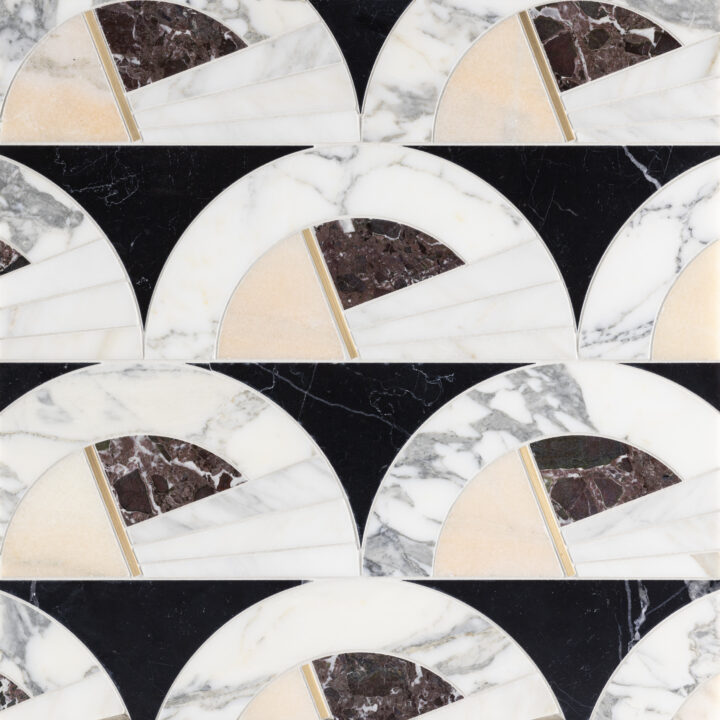 Inspired by the jazz-inflected patterns of Art Deco, Ali Budd’s Opia is a demilune mosaic rendered in two colorways, each featuring five exquisite marbles plus a touch of gleaming metal. Opia Nero includes honed Nero, Arabescato, China White, Rosso Levanto, and Rosa Portogallo marbles with an accent of polished brass. Opia Lilac blends honed Dolomiti, Lilac, White Sand, Thassos, and Statuary with a touch of polished stainless steel.