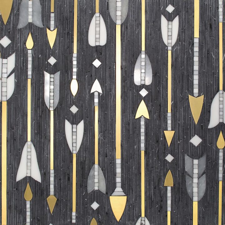 Arrow Rows, a hand-cut mosaic shown in tumbled Nero Marquina, polished Allure, Dolomite, Calacatta Radiance, and Brass, is part of Cean Irmingers second KIDDO Collection. Dimensions reflect image shown.