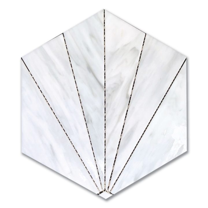 The subtle, linear starburst pattern in this glass hexagon tile can be arranged in a multitude of ways to create a personalized and captivating design ranging from Art Deco to modern.