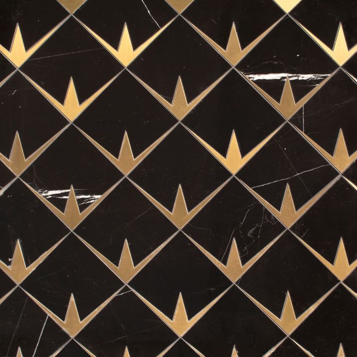 Byron, a waterjet mosaic shown in polished Nero Marquina and brushed Brass, is part of the Bright Young Things Collection. Dimension reflect image shown.