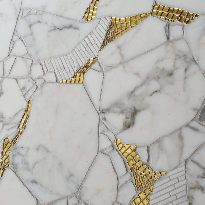 Calade Gold 1 is made up of Calacatta Oro (Honed), Arctic White (Tumbled) and 24K Yellow Gold Glass Mosaic.- NOTES