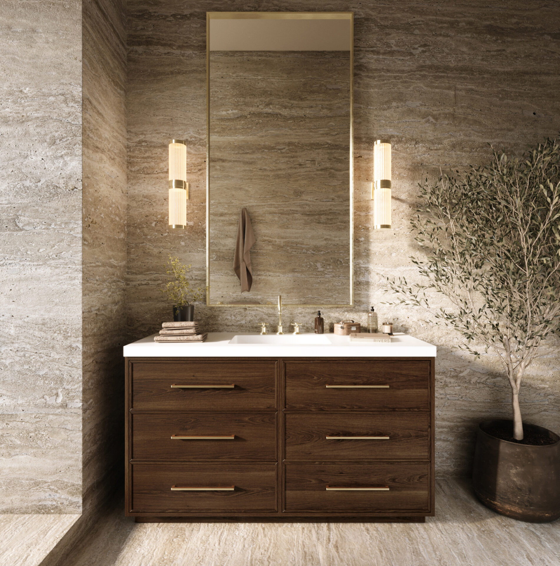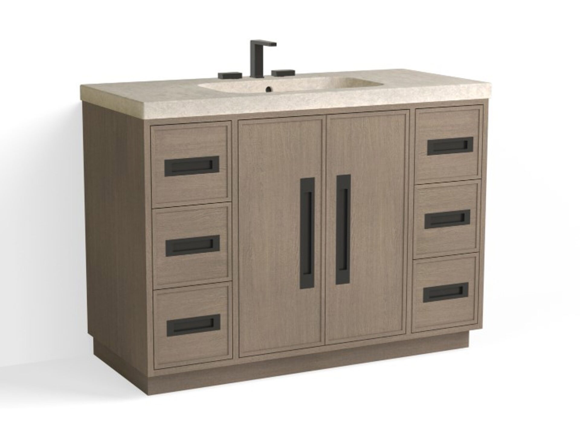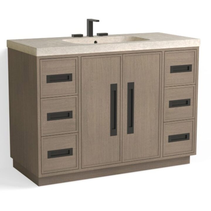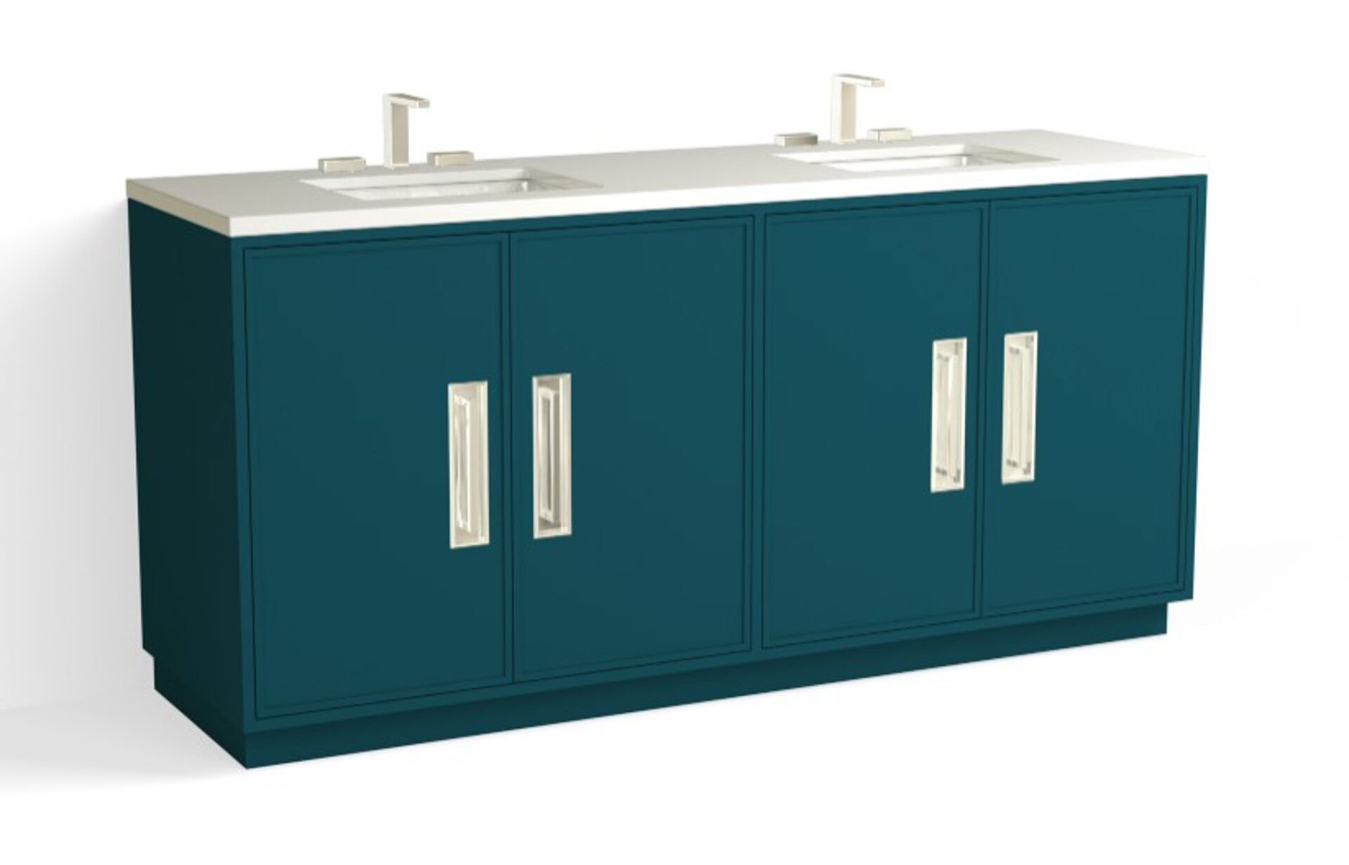 The Calder – 108 is one of the vanity designs available through Decorative Materials. It features a modern, thin-framed cabinet construction with a refined slim Shaker-style door and drawer design. Built for both style and functionality, Calder offers maximum storage with various configurations in sizes from 24″ – 72″ as standard. A 3″ integrated toekick provides a clean, grounded look while maintaining easy access. This design blends classic craftsmanship with contemporary simplicity—ideal for transitional and modern interiors alike.
