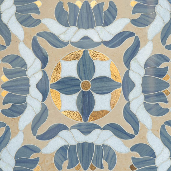 When in Venice, it’s always rewarding to look up! Caterina symbolizes the enchanting frescoes that are framed in ornately carved wood. The serene hues evoke La Serenissima, the grey nebbia fog that shrouds Venice in the winter months, the blue mist of the lagoon, and hints of the city’s ubiquitous gold silk. Shown in honed Lagos Gold, polished Celeste, Aurum, and Blue Macauba.