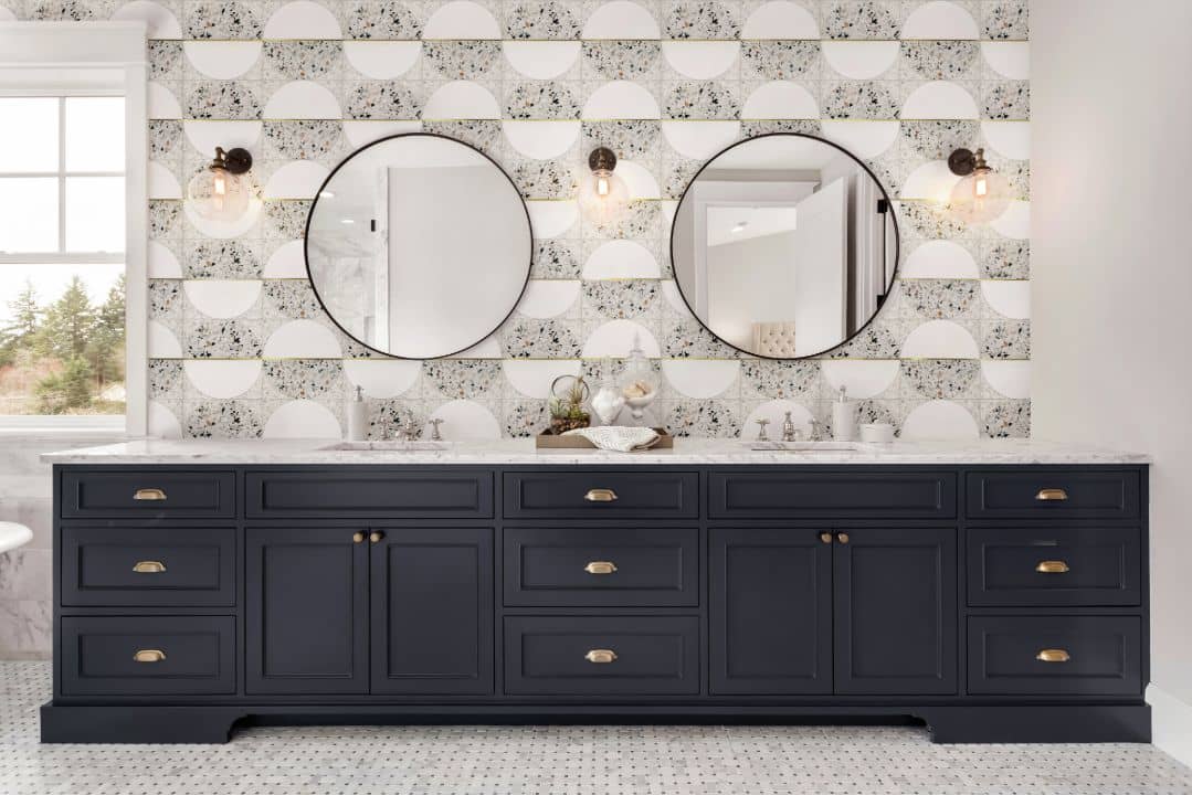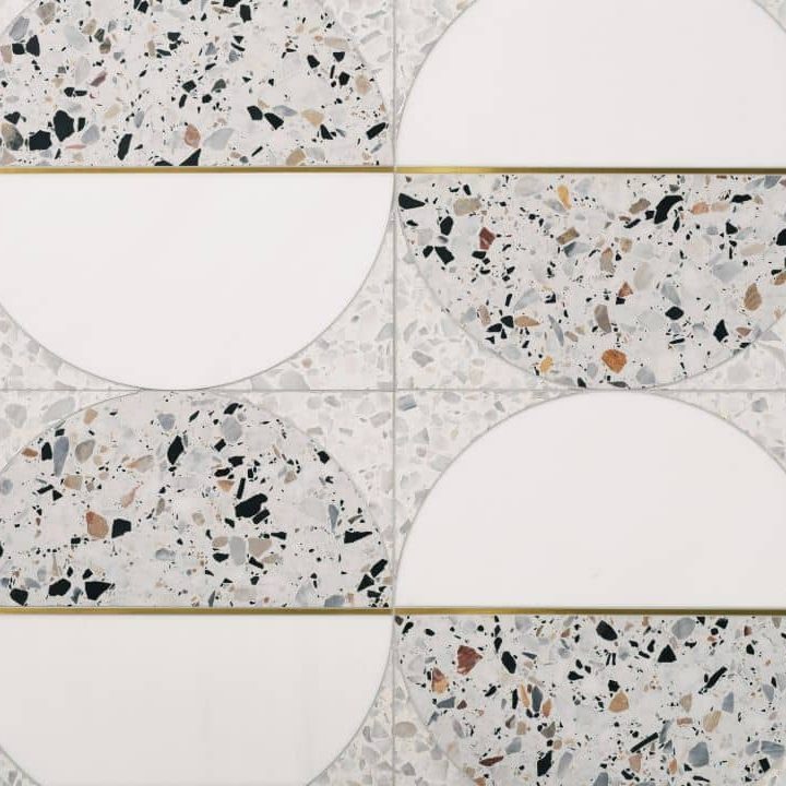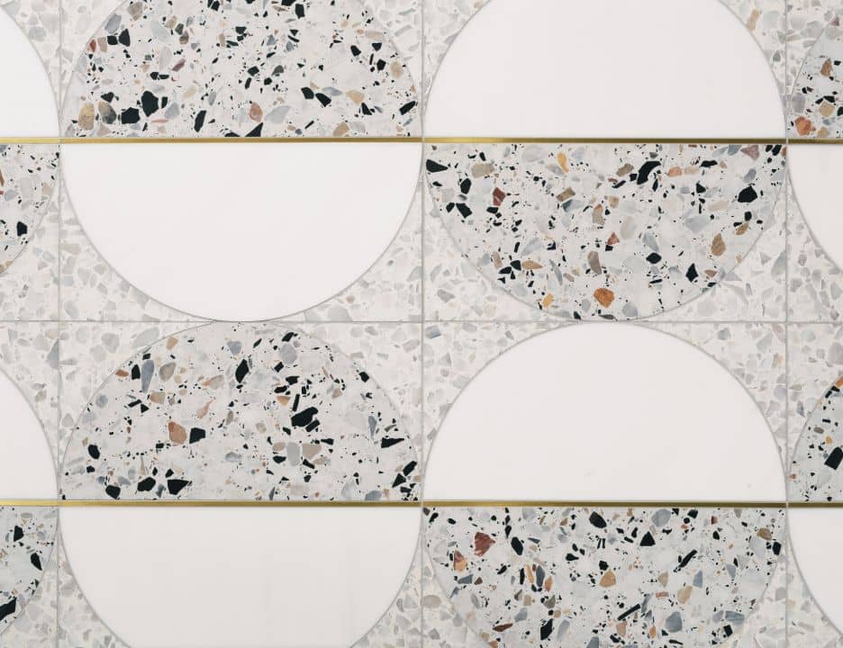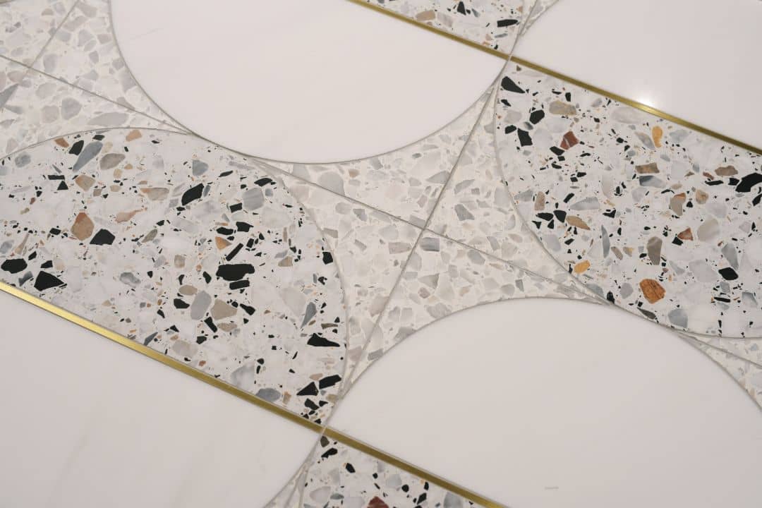 Cerchio gracefully combines stone, terazzo and metal in an avant garde waterjet mosaic pattern.