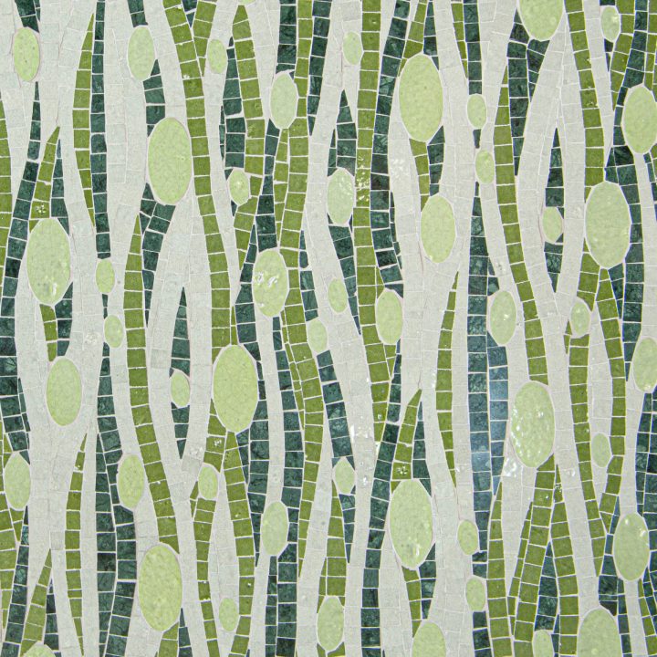 Current, a hand-cut and waterjet mosaic shown in polished Fern, Spring Green, Eucalyptus, and Sweetgrass, is part of the Biome collection by New Ravenna.