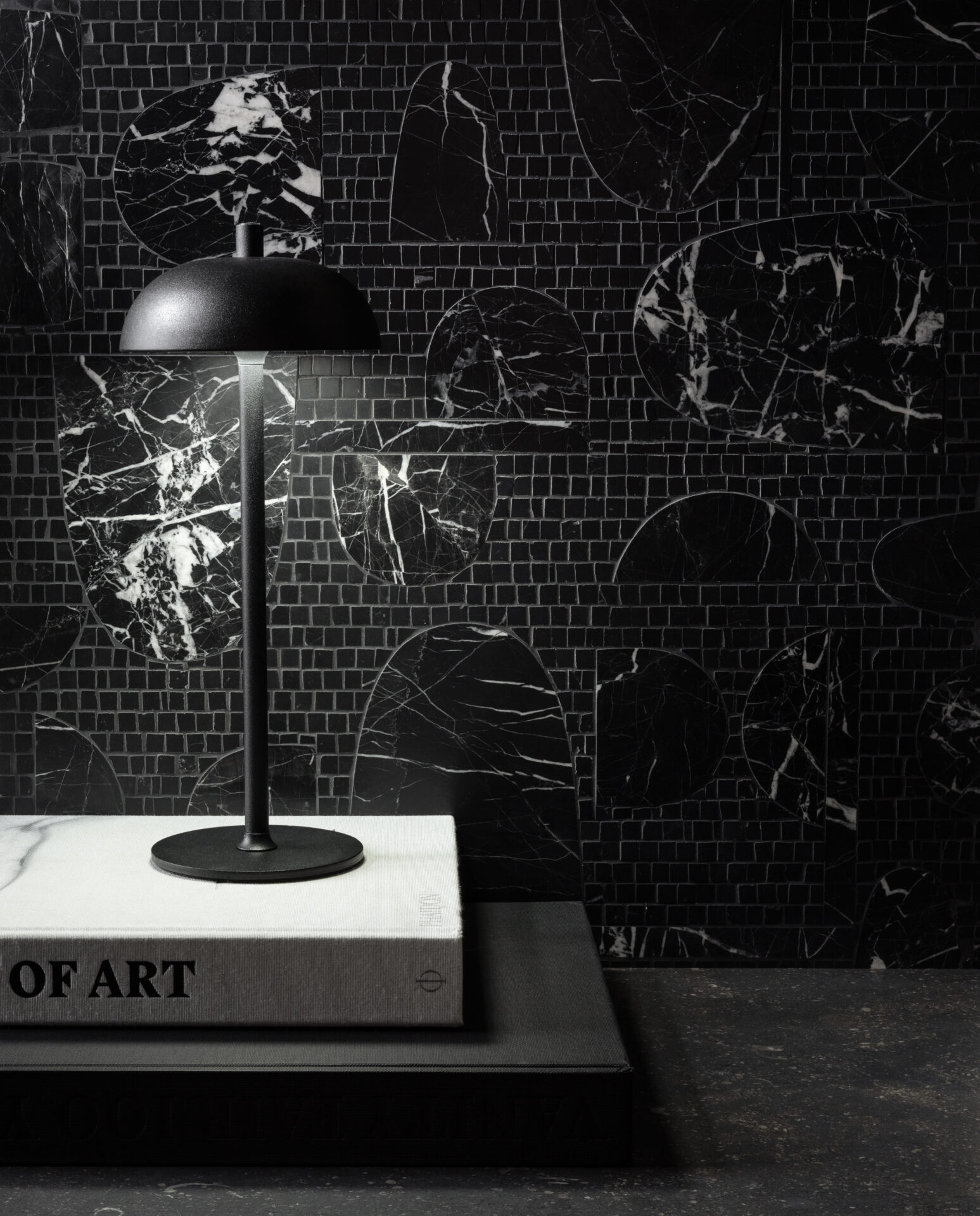 Decadence by Donghia Black transforms Donghia’s refined demilune pattern into a sleek mosaic of honed natural stone. Artisans use waterjet-cut shapes and delicate tesserae to bring the design to life in three contemporary colorways: Black, Blue, and Cream. The Black colorway features rich China Black and Nero marble, while Blue showcases a serene mix of Azul Macaubas and Bardiglio Imperiale. Cream offers a neutral blend of White Sand and Bianco Dolomiti, creating an elegant, understated look.