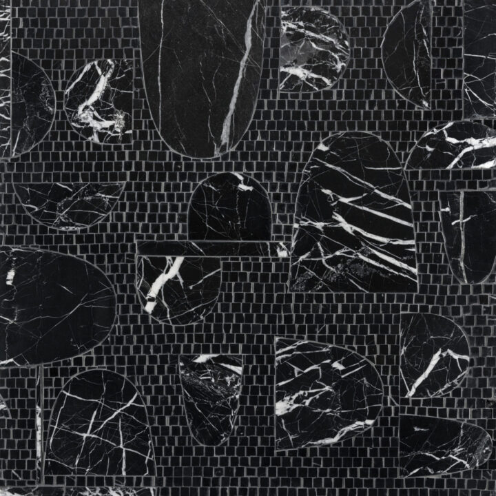 Decadence by Donghia Black transforms Donghia’s refined demilune pattern into a sleek mosaic of honed natural stone. Artisans use waterjet-cut shapes and delicate tesserae to bring the design to life in three contemporary colorways: Black, Blue, and Cream. The Black colorway features rich China Black and Nero marble, while Blue showcases a serene mix of Azul Macaubas and Bardiglio Imperiale. Cream offers a neutral blend of White Sand and Bianco Dolomiti, creating an elegant, understated look.