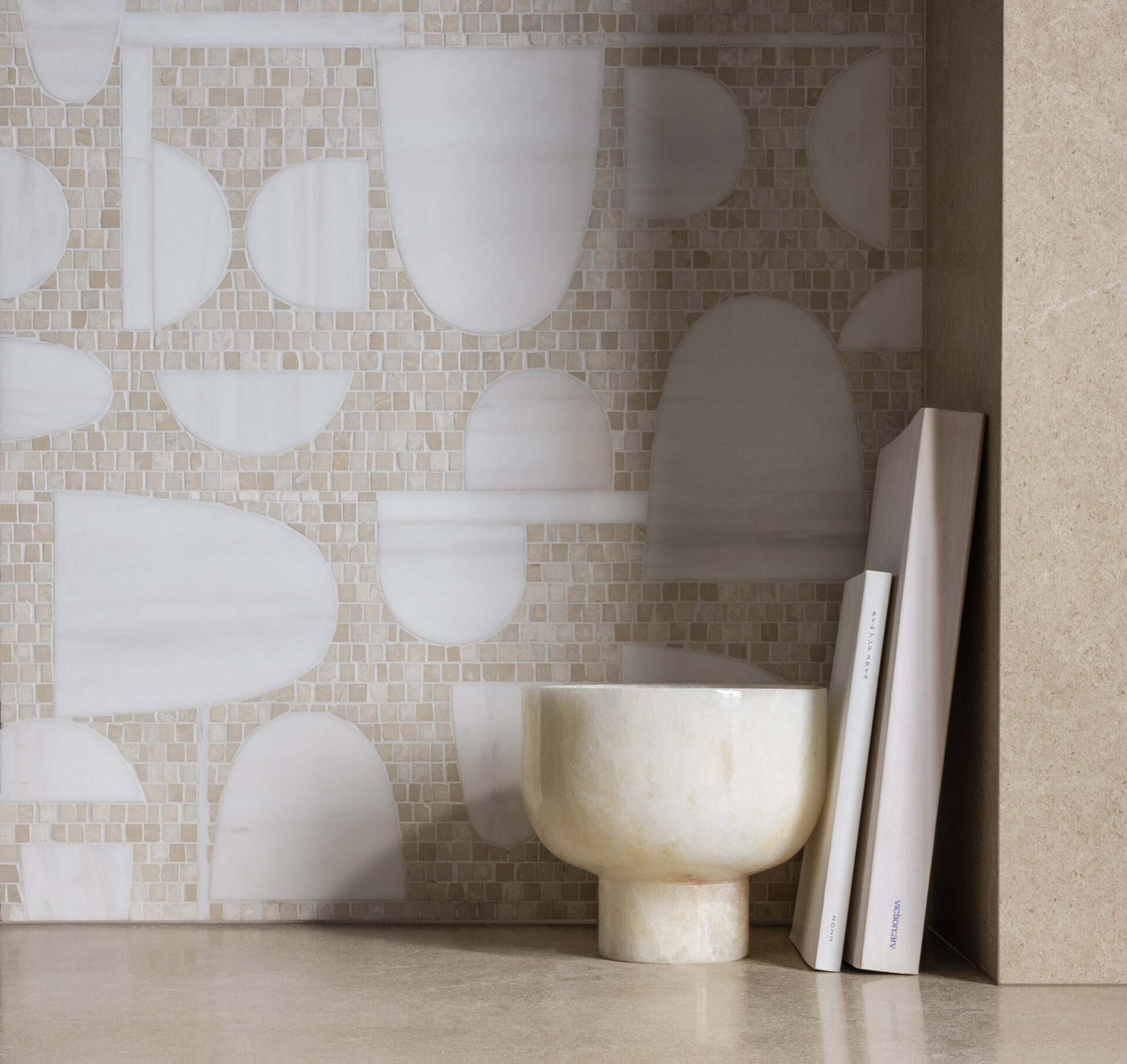 Decadence by Donghia Cream transforms Donghia’s refined demilune pattern into a sleek mosaic of honed natural stone. Artisans use waterjet-cut shapes and delicate tesserae to bring the design to life in three contemporary colorways: Black, Blue, and Cream. The Black colorway features rich China Black and Nero marble, while Blue showcases a serene mix of Azul Macaubas and Bardiglio Imperiale. Cream offers a neutral blend of White Sand and Bianco Dolomiti, creating an elegant, understated look.