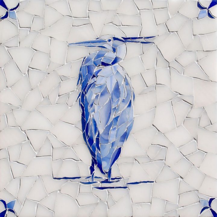 Delft Egret, a classic Dutch style hand-cut blue and white jewel glass mosaic, shown in Opal Sea Glass with jewel glass Lapis Lazuli, Iolite, and Covelite, is part of the Sea Glass Collection.