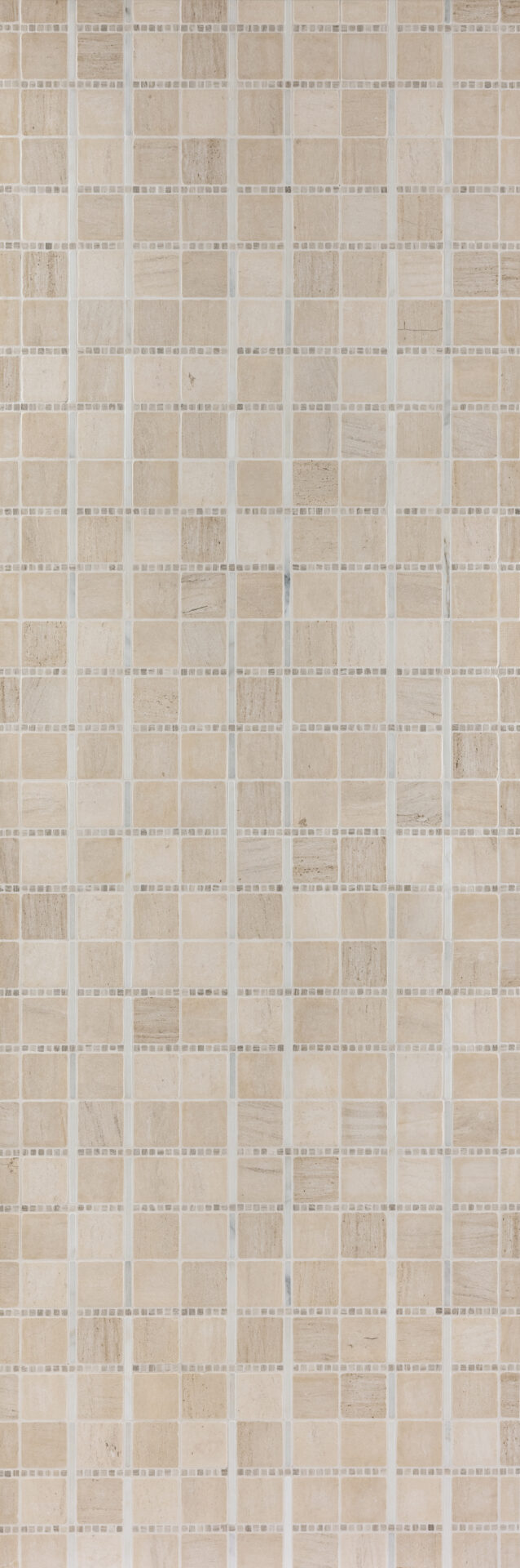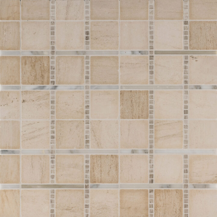 Double Check Moca Mosaic is from a collection inspired by the timeless appeal of stripes and plaids. The Handloom Collection offers three distinct patterns for countless design possibilities. Double Check showcases an intricate tumbled 3 x 3 design, where two-tone checks gracefully intertwine. This reinterpretation of a classic pattern is available in Pink, Moca, and Viola colorways, combining soft, luxurious stones like Rosa Perlino, Calacatta Gold, Bianco Antico, Belgian Blue, and Viola, in serene, understated palettes.