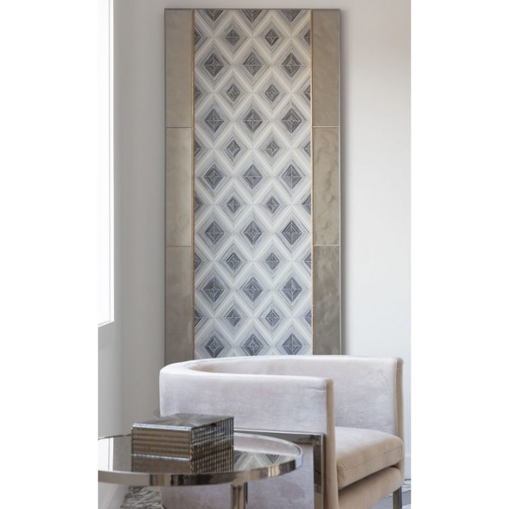 Thin strips of glass encircle the center of each glass diamond that composes Echo, reducing in color as they form a spectrum from center to edge. The gradient effect repeats across the surface of the pattern, creating an overall consistency that complements the detailed complexity internal to each diamond.