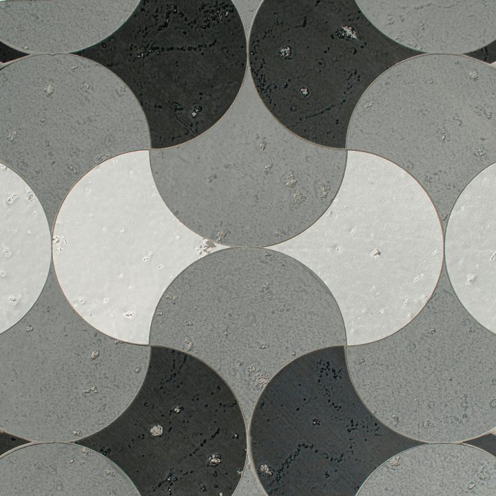 Elodie, a stone waterjet mosaic shown in Dahlia matte, Spanish Moss, and Oleander Glazed Basalto™ from the Fall 2020 collection by New Ravenna for Decorative Materials. - NOTES
