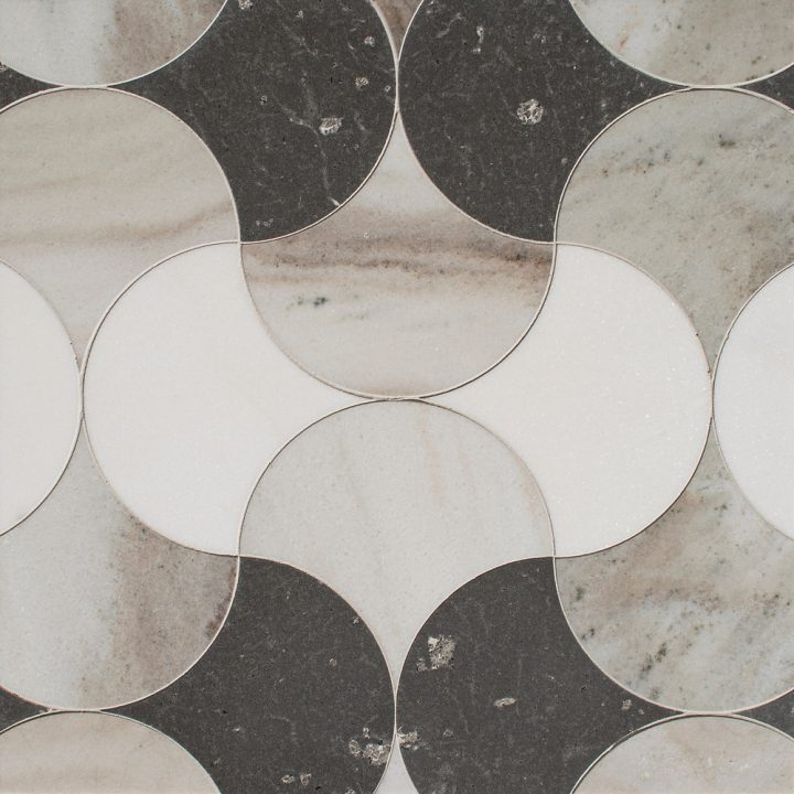 Elodie, a stone waterjet mosaic shown in honed Basalto Orvieto, Cashmere, and Thassos by New Ravenna for Decorative Materials. - NOTES