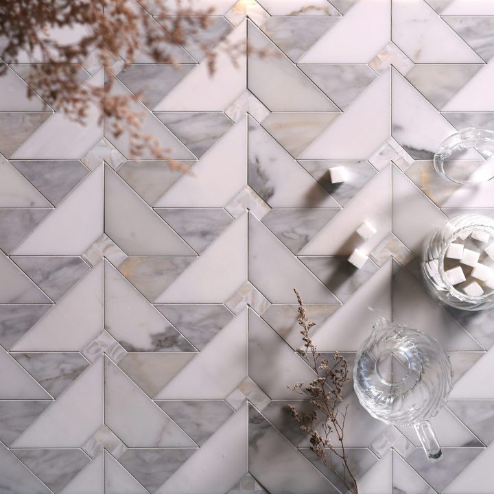 - Calacatta Oro (Polished), Arctic White (Polished), Pacifica Blue (Polished), Seashell (Mother of Pearl)