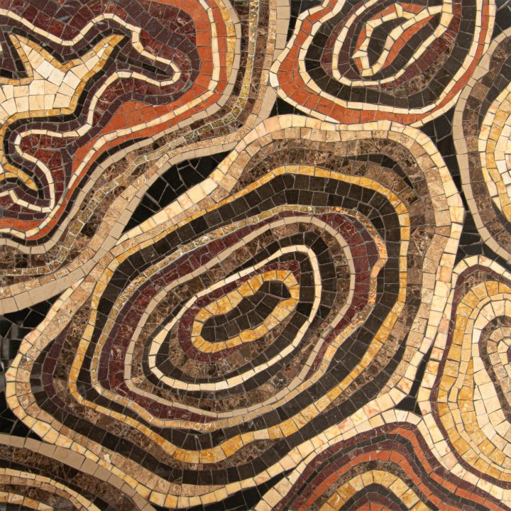Geode, a hand-cut stone mosaic shown in polished Rojo Alicante, Saint Laurent, Emperador Dark, Giallo Reale, Crema Valencia, Travertine Noce, Aurum, Aegean Brown, Red Lake, honed Jerusalem Gold and Nero Marquina, is part of the Biome collection by New Ravenna.