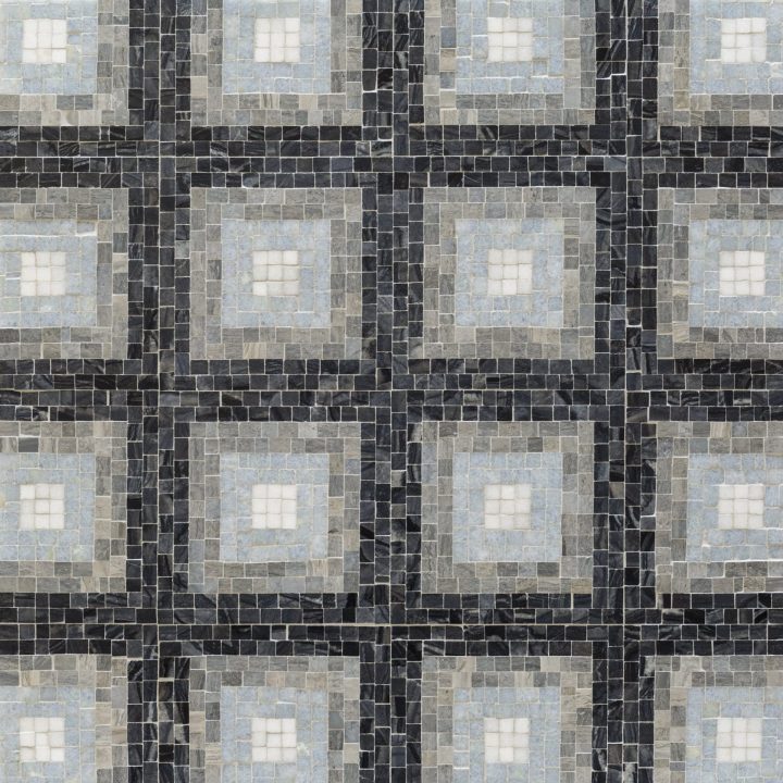 Inspired by the Jazz Glass pattern, Hip 2B stone beautifully showcases a classic mosaic pattern of tonal bands in alternating colors. Hip 2B stone Black & Blue is composed of sequential bands of Silver Wave, Blue Travertine, Azul Cielo, and Thassos in Each square. Hip 2B stone Grey is designed with Bianco Carrara, Statuary, and Bianco Dolomiti, bringing a spectrum of grey tones to life.